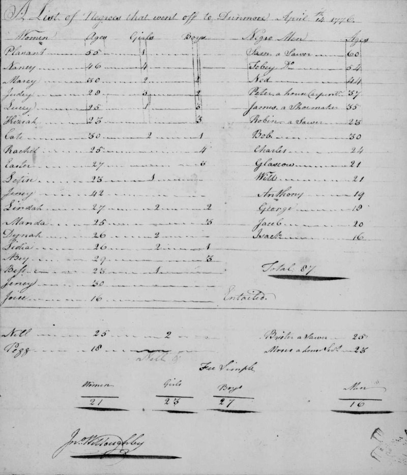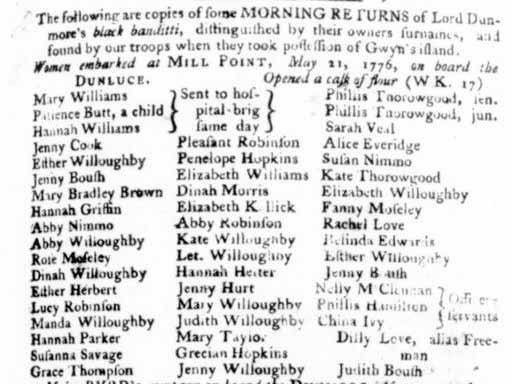 John Willoughby Jr., a Norfolk plantation owner, reported that on April 14, 1776, a month before Dunmore left for Gwynn’s Island, about 87 of the people he enslaved had escaped.10 From this report, filed as a petition to the Virginia government for compensation, we learn more about some of the women who were with Dunmore. Marey was 30 years old. Almost all brought children with them. More women escaped than men—21 women to 16 men.11