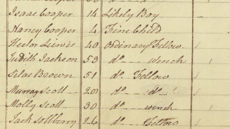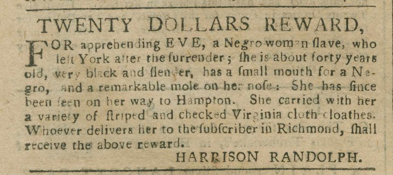Eve was highly skilled, and possibly a personal maid. She was among the highest-valued individuals on the Randolph estate, listed at £100. A year after her escape, Randolph’s nephew placed a runaway advertisement offering a reward for her return. From this, we learn that she was about 40 years old, had a mole on her nose, “carried with her a variety of striped and checked Virginia cloth clothes,” and that she was last seen heading toward Hampton. The Randolphs soon recaptured Eve. A codicil to the will of Betty Randolph (the widow of Peyton Randolph) dated July 20, 1782, notes that she had sold Eve due to her “bad behavior,” likely a reference to her recent escape.15 The rest of her story remains unknown.