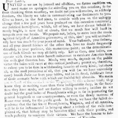 In eighteenth-century Virginia, women owned and operated business of all kinds, from printing presses to taverns. Their livelihoods became entangled in revolutionary politics with the rise of non-importation agreements—pledges to stop importing and purchasing British goods to pressure Parliament to repeal unpopular taxes and policies. Signers of these agreements promised not to import goods from Great Britain. At the same time, consumers were urged not to purchase imported goods in colonial stores.2