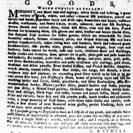 These agreements directly affected female business owners like milliner Catherine Rathell. Rathell came from Britain to Virginia in the 1760s and started her business in the millinery trade.3 She sold fashionable goods imported from Great Britain in her store, including handkerchiefs, fans, and shoe buckles.4 When Virginia’s merchants halted British imports in 1774, Rathell faced a crisis. How could she sustain her business without imported goods? Ultimately she chose to return to England, planning to stay “until liberty of importation is allowed.”5 Just miles from the English shore, the ship she was on got caught in a hurricane and she perished in a shipwreck.6 Though the end of her story was atypical, she was just one of the many colonial women whose business was affected by revolutionary politics.