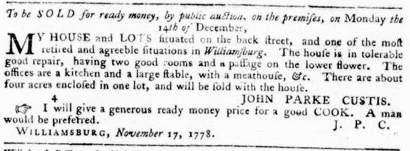 With George Washington’s approval, John Parke Custis put the Custis Square land and house for sale in 1778. Virginia Gazette (Dixon and Hunter), Nov. 27, 1778, page 3.
