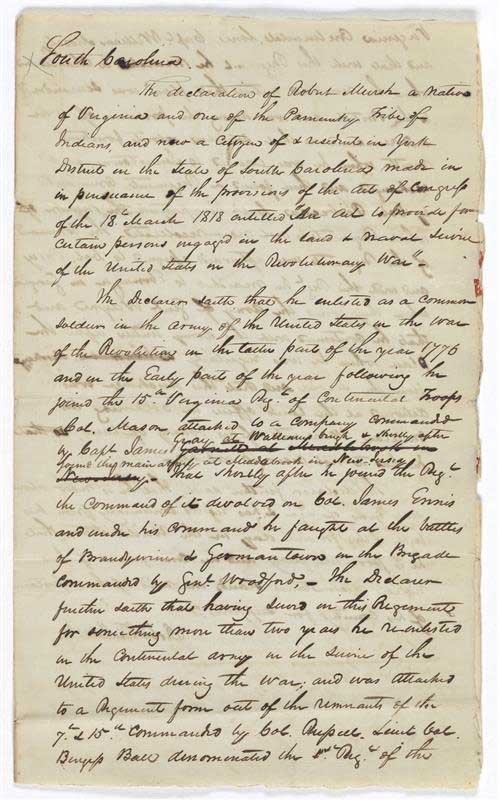 - Robert Mursh (Pamunkey), M804 Roll 1797 W.8416, Revolutionary War Pension Petition, 1818, National Archives, Washington, D.C.; Buck Woodard, “Students of the Brafferton Indian School,” in Building the Brafferton: The Founding, Funding, and Legacy of America’s Indian School, Danielle Moretti-Langholtz and Buck Woodard, eds. (Williamsburg, Va: Muscarelle Museum of Art, 2019), 1329-136.