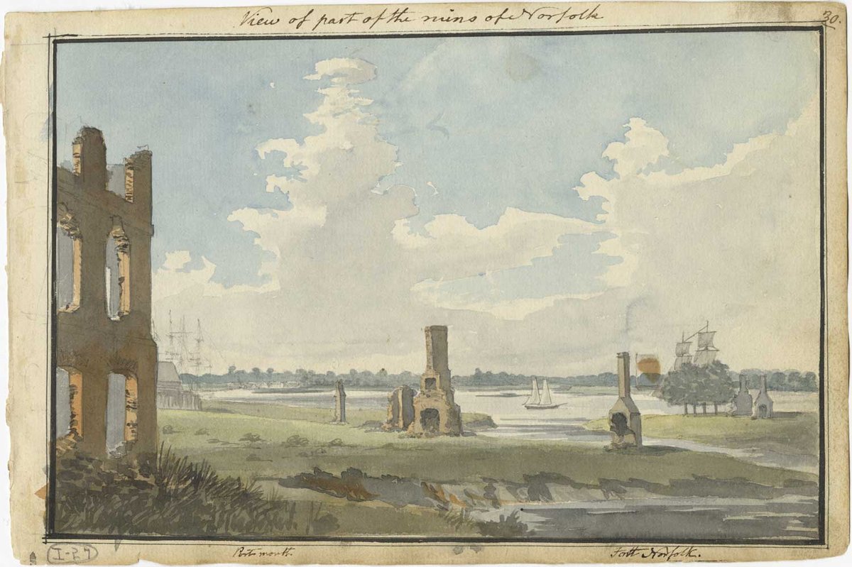 Virginia’s royal governor, Lord Dunmore, had been living on a ship in Norfolk since fleeing Williamsburg in June 1775. With Patriots occupying Norfolk, Dunmore’s flotilla was cut off from supplies. In late December, the British forces threatened to bombard Norfolk in order to gain access to the city and its supplies, and followed through on January 1. Patriots added fuel to the fire, literally. They set fire to the city, in part to punish its Loyalists and in part to make Norfolk uninhabitable so the British could not occupy it. Norfolk was in ruins.2